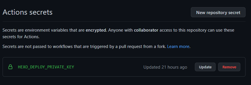 之前在使用 Vuepress 构建静态站点时配置了 GitHub Actions 来实现 CI 流程,现在准备配置到 Hexo Blog 上实现提交分支代码自动部署到 GitHub Page 中。